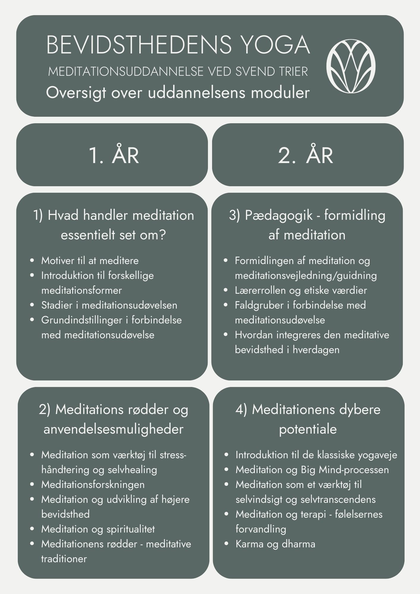I alt for begge år: 6 undervisningsweekender/12 dage + 4 meditationsretreats, i alt 20 dage/16 overnatninger